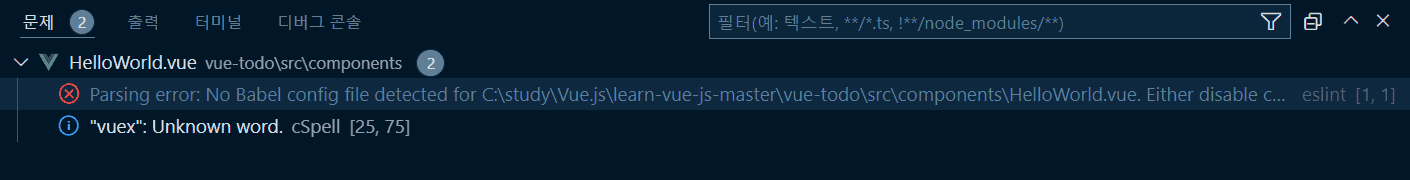 Parsing error: No Babel config file detected for C:\study\Vue.js\learn-vue-js-master\vue-todo\src\components\HelloWorld.vue. Either disable config file checking with requireConfigFile: false, or configure Babel so that it can find the config files.