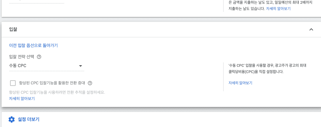 캠페인 설정 선택에서 입찰 관련 수동 cpc 선택 후 향상된 cpc 입찰기능 활용한 전환증대 체크가 활성화 되어 있지 않습니다. ㅠ