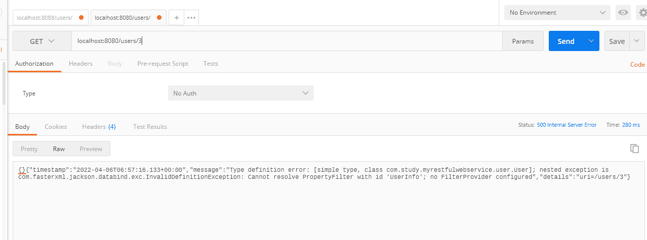 Type definition error: [simple type, class com.study.myrestfulwebservice.user.User]; nested exception is com.fasterxml.jackson.databind.exc.InvalidDefinitionException: Cannot resolve PropertyFilter with id 'UserInfo'; no FilterProvider configured