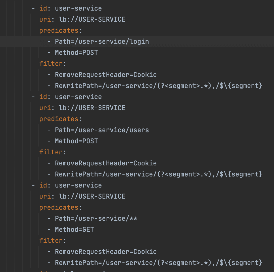 - RewritePath=/user-service/(?<segment>.*),/$\{segment} 이 모양과