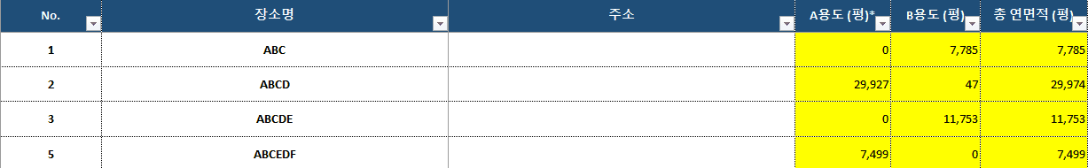 여러 장소별로 A용도/B용도 면적을 나누어서 입력한 데이터가 있고,
