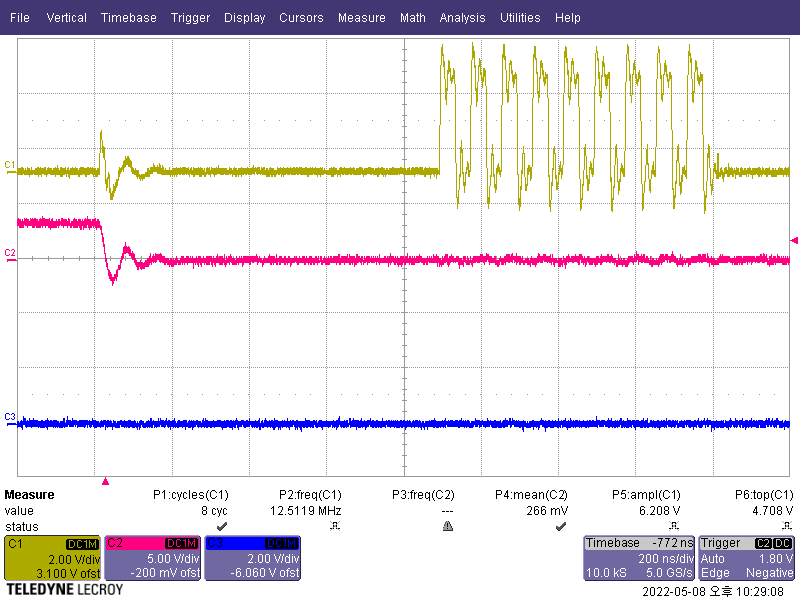 그림처럼 스위칭 노이즈로 보이는 노이즈가 상당히 크게 발생됩니다.