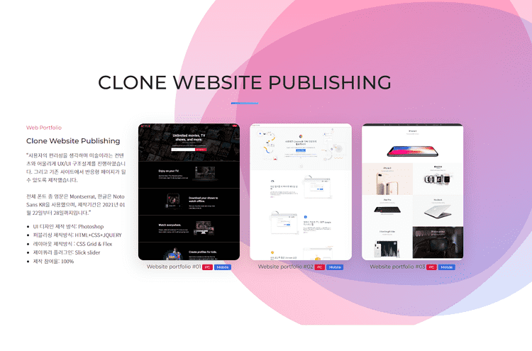 그리고 개인 포트폴리오 홈페이지에 클론 코딩이라는 섹션에 3가지를 보여줍니다.