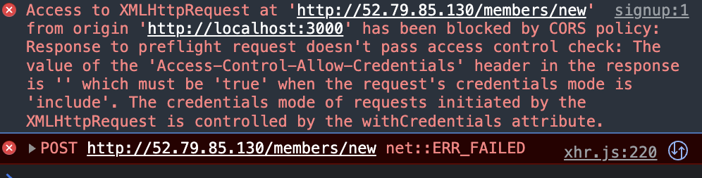 프론트에서 제가 프록시를 이용하지는 않고 있고 제 로컬에서 배포된 서버주소로 요청을 하면 이런식으로 오류가 뜨고 있는데, 혹시 어떻게 해야할지 궁금합니다...react에서