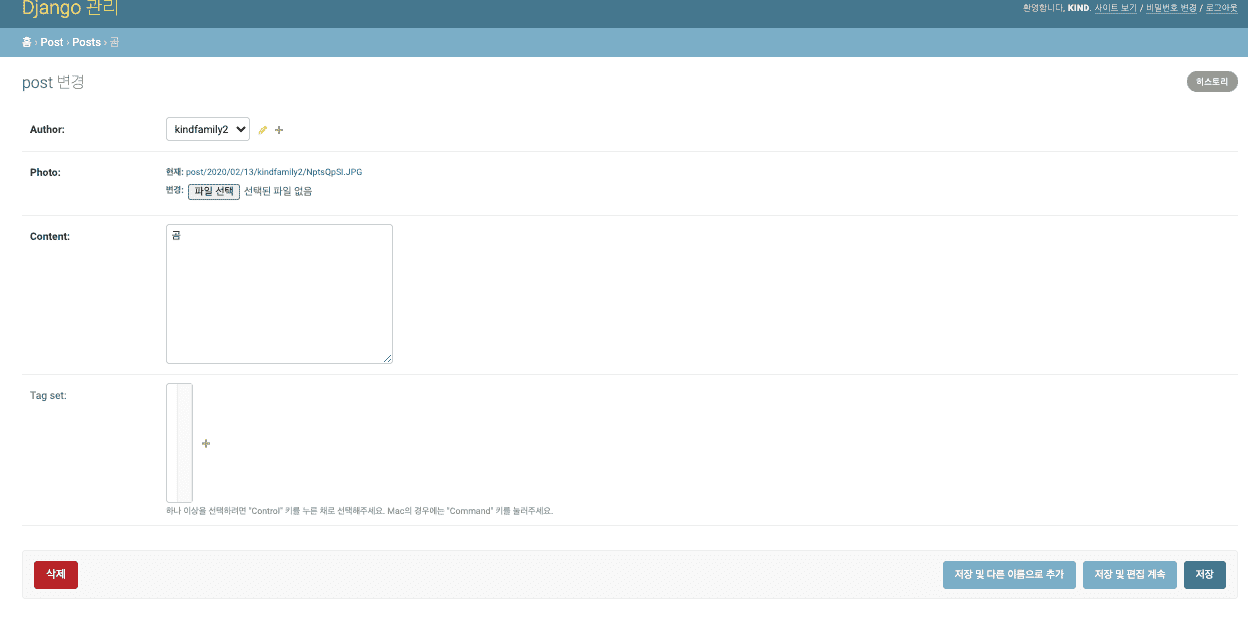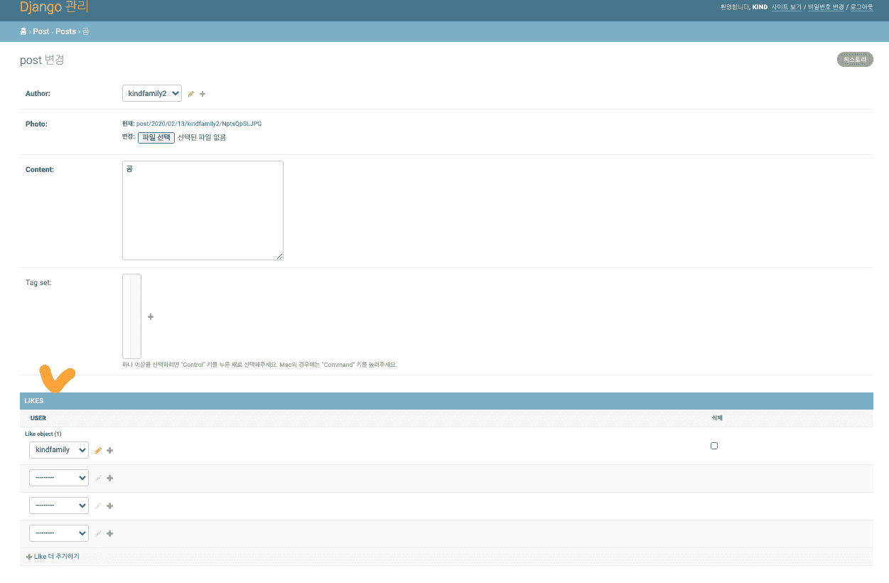 글 관리 어드민에 접속을 하시면 like한 사용자를 관리할수 있는 부분이 나옵니다