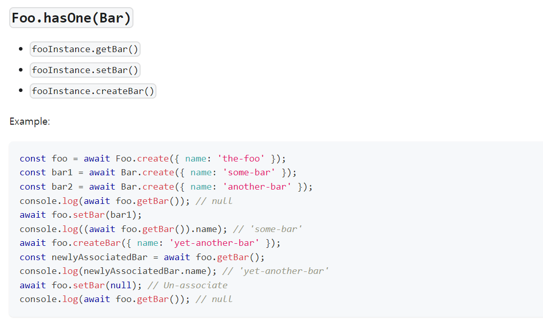 그래서 foo.setBar(bar1)하는 것이고, foo.createBar({ name: 'yet-another-bar' }) 하는 겁니다.
