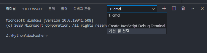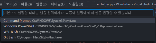vs code 터미널 창 우측에 보면 위 이미지처럼 기본쉘을 선택하는 메뉴가 있습니다.