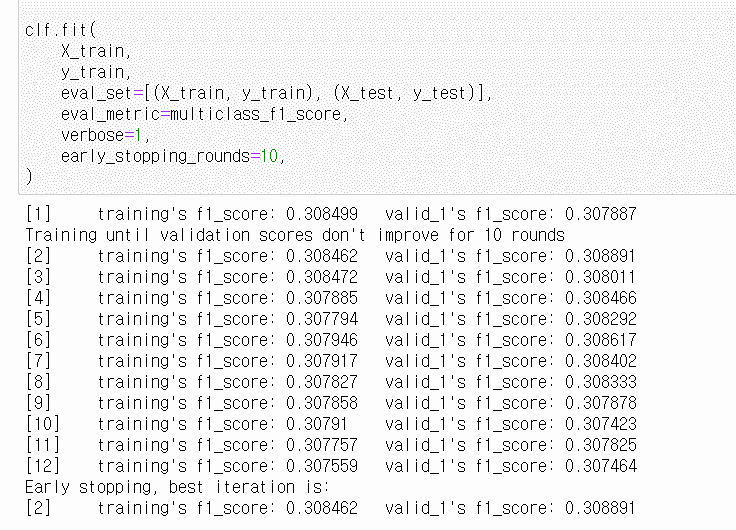> 8-2. f1 score를 eval metric으로 변경할 경우 이후 LightGBM이 모델을 피팅할 때 f1 score를 향상시키는 방향으로 학습하는 것이 아닌가요? 왜 이렇게 낮은 정확도에서 early stopping이 발생하는지 이해가 되지 않습니다. (스크린샷에는 early_stopping_rounds=10이지만, 500으로 두고도 테스트해봤으나 별반 차이가 없었습니다)
