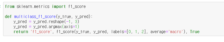 8. LightGBM에서 F1 score를 평가 메트릭으로 사용하기 위해(주최측에서 macro f1 score를 평가지표로 활용한다고 발표) 아래처럼 메서드를 생성하여 학습을 진행하였는데, 이후 채점시 정확도가 10% 가량 하락했습니다. 여기서 세 가지 질문이 있습니다.