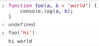 오... 교수님! 엄청 열심히 들어주셔서 감사합니다..!! ㅋㅋㅋ 되게 좋은 질문 해주셨는데요. 함수의 파라미터에 기본 값을 넣게 되면 해당 함수를 호출할 때 인자가 없으면 기본 값으로 설정됩니다. 위에 첨부해주신 코드를 기준으로 foo('hi'); 를 호출하면 아래와 같이 될거에요 :)