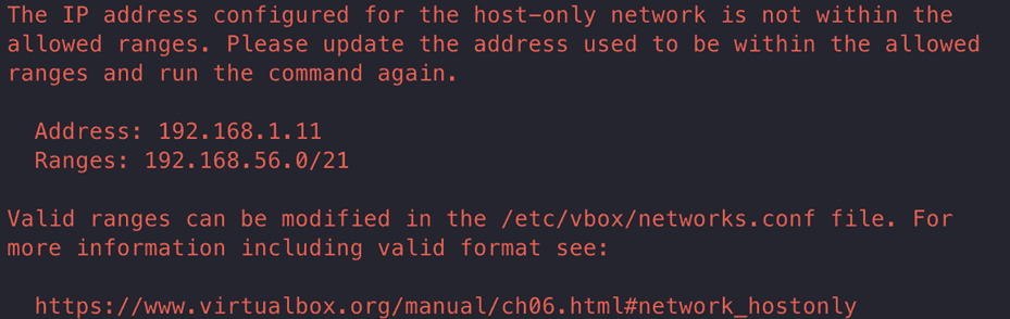 If you are using MAC or Linux as a host and trying to change the host-only network setting with Vagrant in VirtualBox 6.1.28 or later, the following error will occur and the process will not proceed .