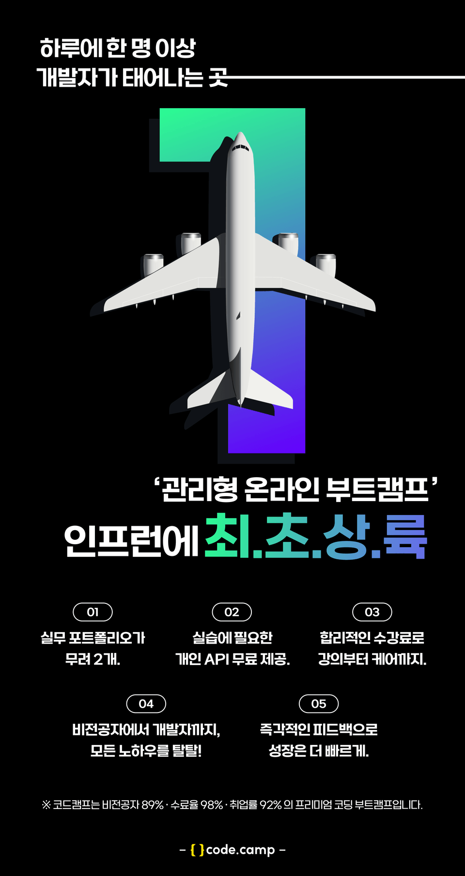 The class we needed! This is the 'real' managed developer bootcamp that first appeared on Inflearn. To grow quickly, a 'systematic curriculum' and 'proper management' are essential. Codecamp, which produces more than one developer per day, provides everything from classes to care with a reasonable tuition fee, packed with real know-how. Codecamp supports everyone to have a chance to learn, regardless of their major, other job, or knowledge level 💪🏻