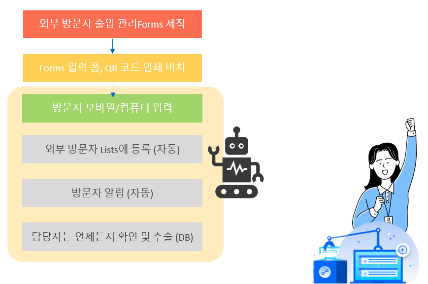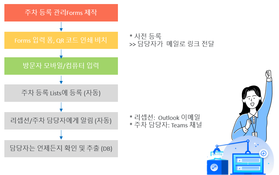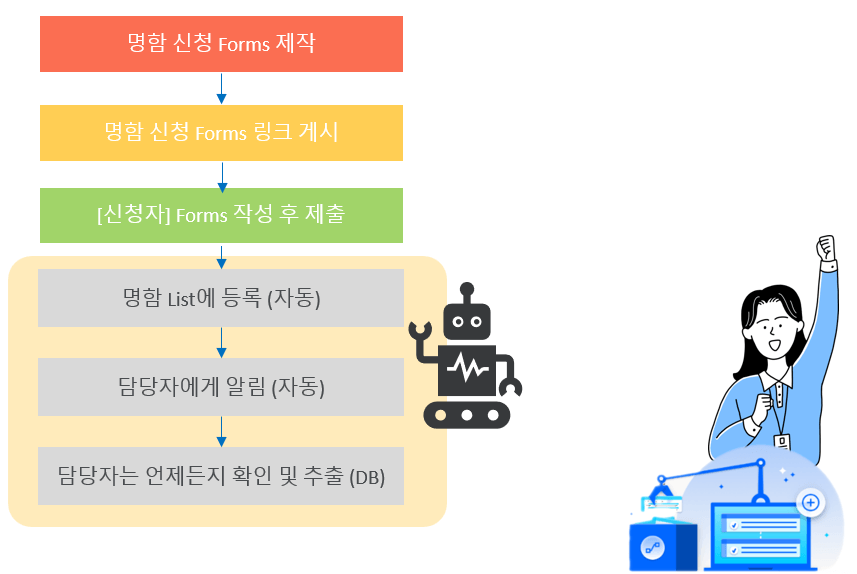 Since the company does not have a separate system developed, tasks such as requesting business cards, registering external visitors, and managing parking requests that require time-consuming manual processing via email and paper printing are managed through a system created using SharePoint+List+Forms and automated with Power Automate.