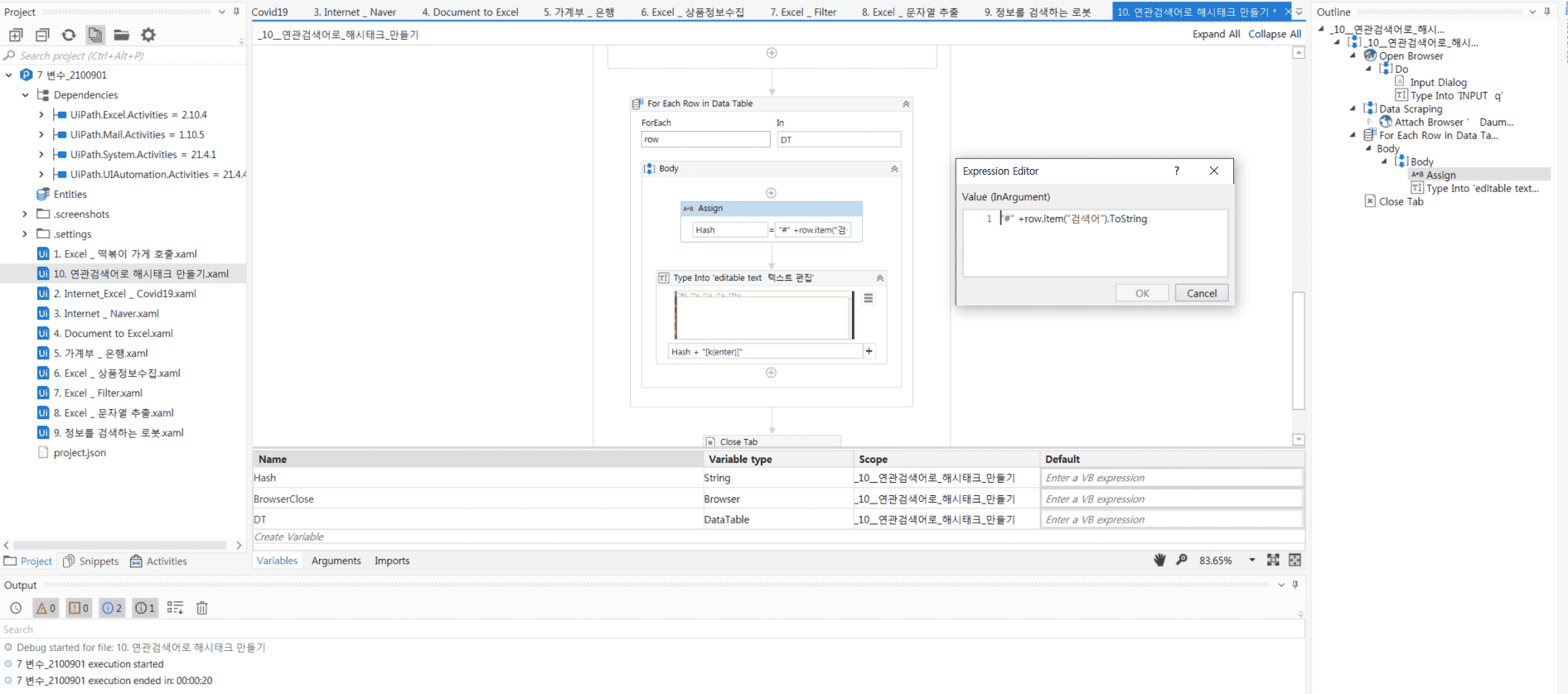 강의에서 String Type의 Hash 변수를 만들고 For Each Row에 를 넣어줘서 똑같이 따라서 했는데 에러가 메모장에 Hash 값(크롬 > 다음 > 검색어 입력 > 연관검색어 데이터스크래핑 후 로봇이 종료됨)을 입력하지 못하고 로봇이 종료됩니다.