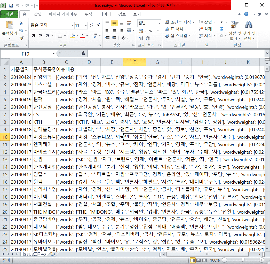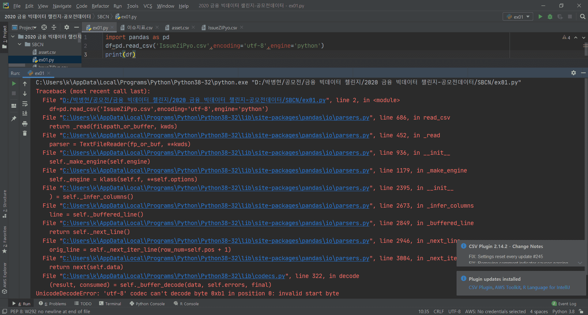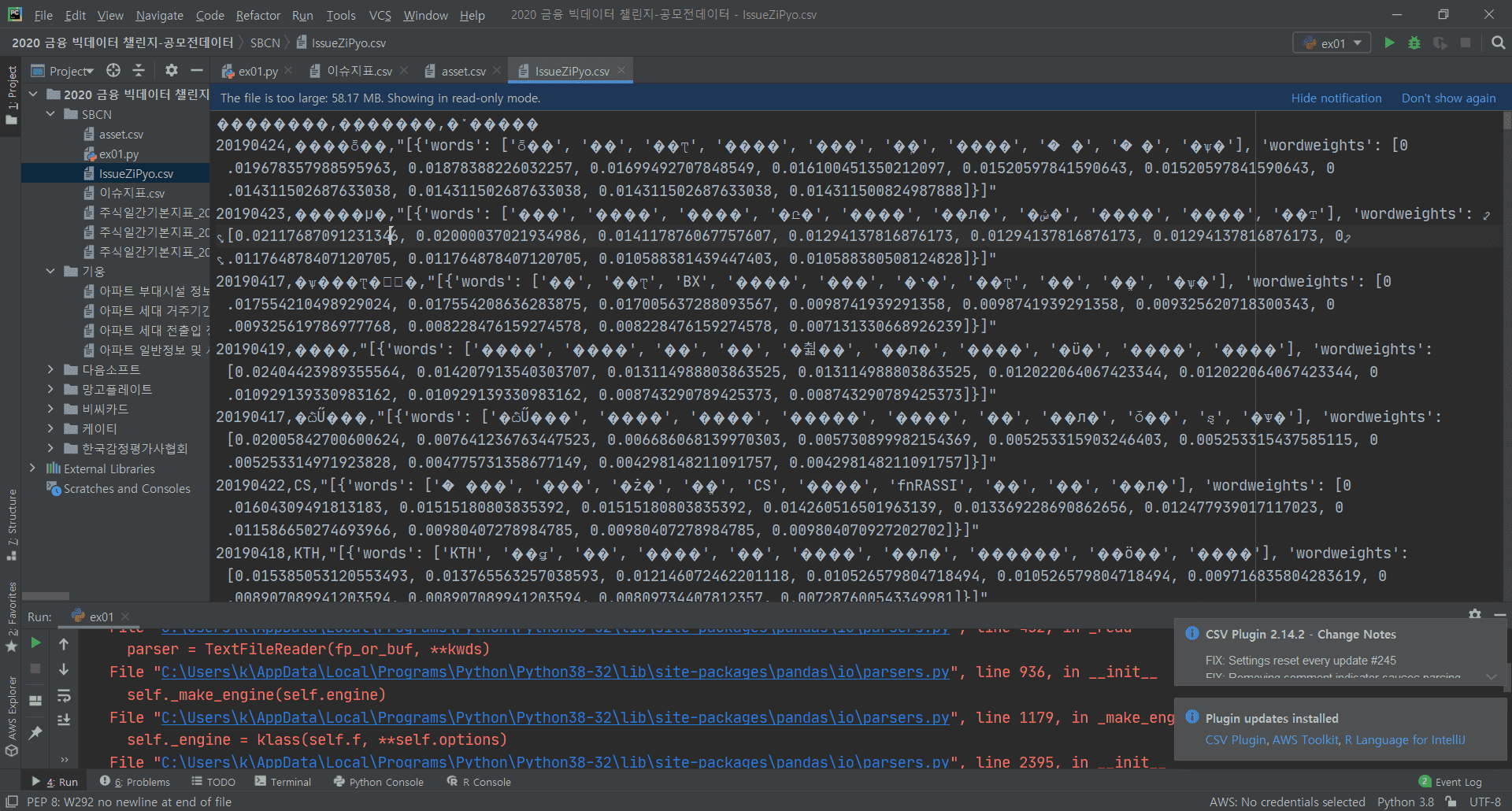 와 같은 파일이고 엑셀내부에서도 utf-8로 인코딩하게도 바꿔봤지만 파이참에들어가서 csv파일을 선택하면 다음 사진과 같이 인코딩이 되지 못한채로 보여지고 있습니다.
