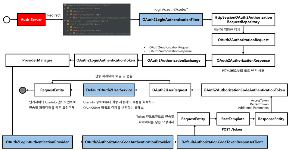 3. For example, it was good to practice authorization requests with Postman and then move to Spring. Well, since the speed of the speech is fast without any special points, it feels like important stories are flowing by. For example, when requesting authorization for the first time, when you press the login button, the client requests /oauth2/authorization, and when the client requests a temporary code from the authorization server, it goes down to /oauth2/authorize, but since this just happens, I couldn't recognize it for a while. It was quite confusing and confusing for a long time. So I got used to it by debugging it one by one. I think it may be because the instructor is so familiar with it, but when you are teaching, you say, "This URL may be a bit confusing. The initial login is /oauth2/authorization, and the code request is /oauth2/authorize. In reality, the authorization process starts when the client requests a code, so authorize means granting permission, so /oauth2/authorize is the URL for requesting a code. In this context, it would be good to remember it." If you explain it once, it will be a very helpful point for students.