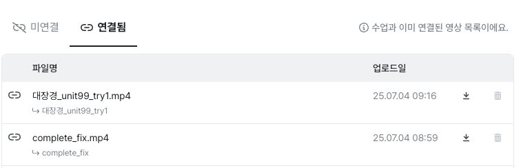 - 미연결: 아직 수업과 연결되지 않은 영상