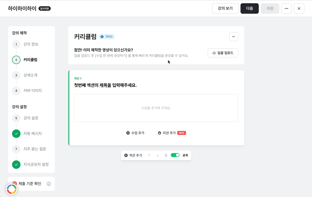 4️⃣ 일괄 업로드 모달을 닫으면, 새 섹션에 수업이 생성된 것을 확인할 수 있습니다.