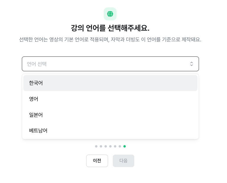 '강의 만들기' 페이지의 마지막 단계에서 강의 언어를 선택할 수 있어요.