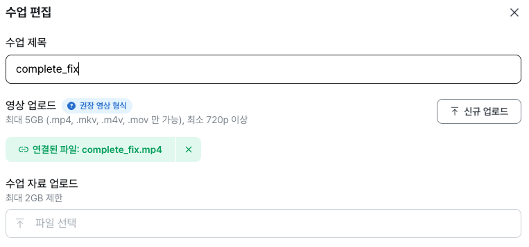 - 업로드된 영상 옆 삭제[X] 클릭 시, 수업 연결 해제가 가능해요.