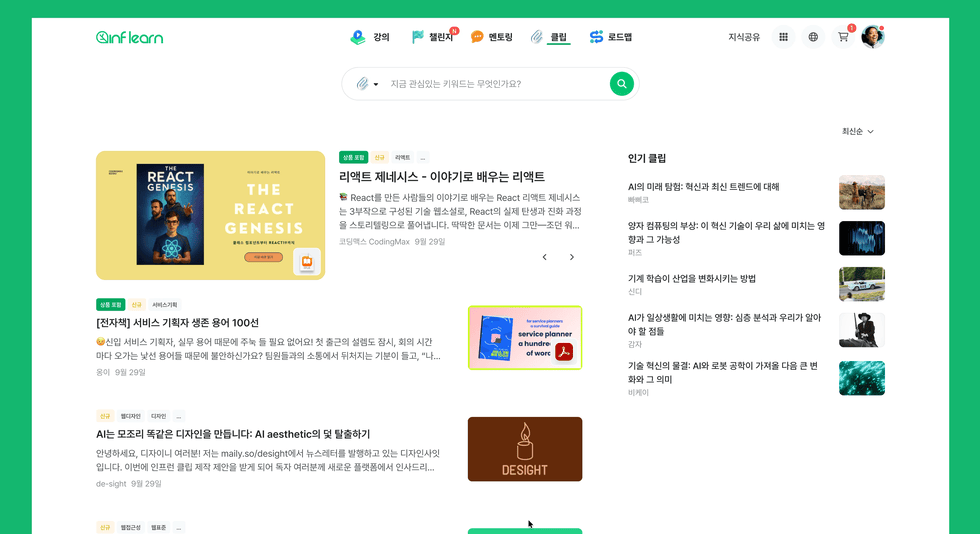 이제는 업계 주요 소식과 다양한 아티클, 업무에 필요한 템플릿, 짧은 영상 모두 인프런에서 만나보세요.