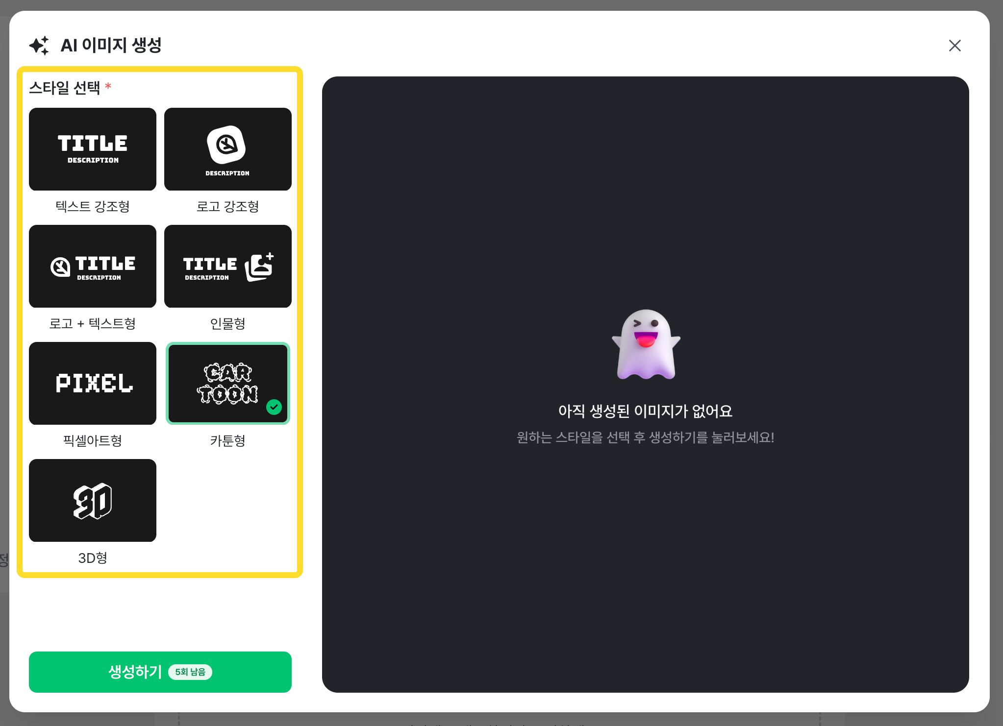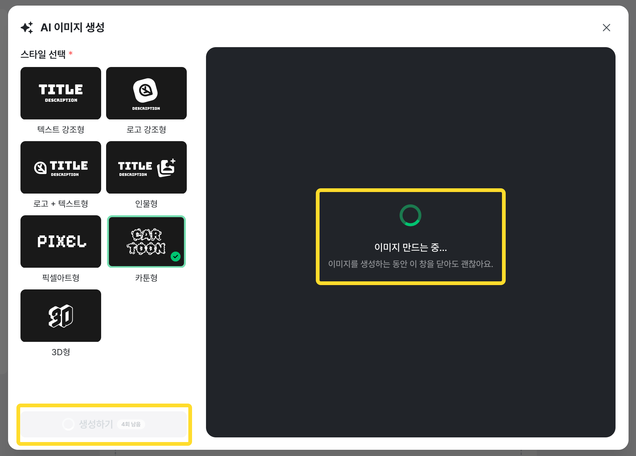 - 생성 횟수는 5회(총 20장)으로 제한됩니다.