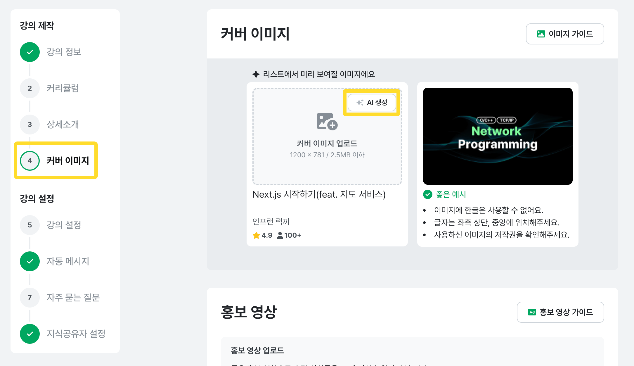 이제 강의 만들기의 커버 이미지 단계에서 'AI 이미지 생성' 버튼을 만나보실 수 있어요.