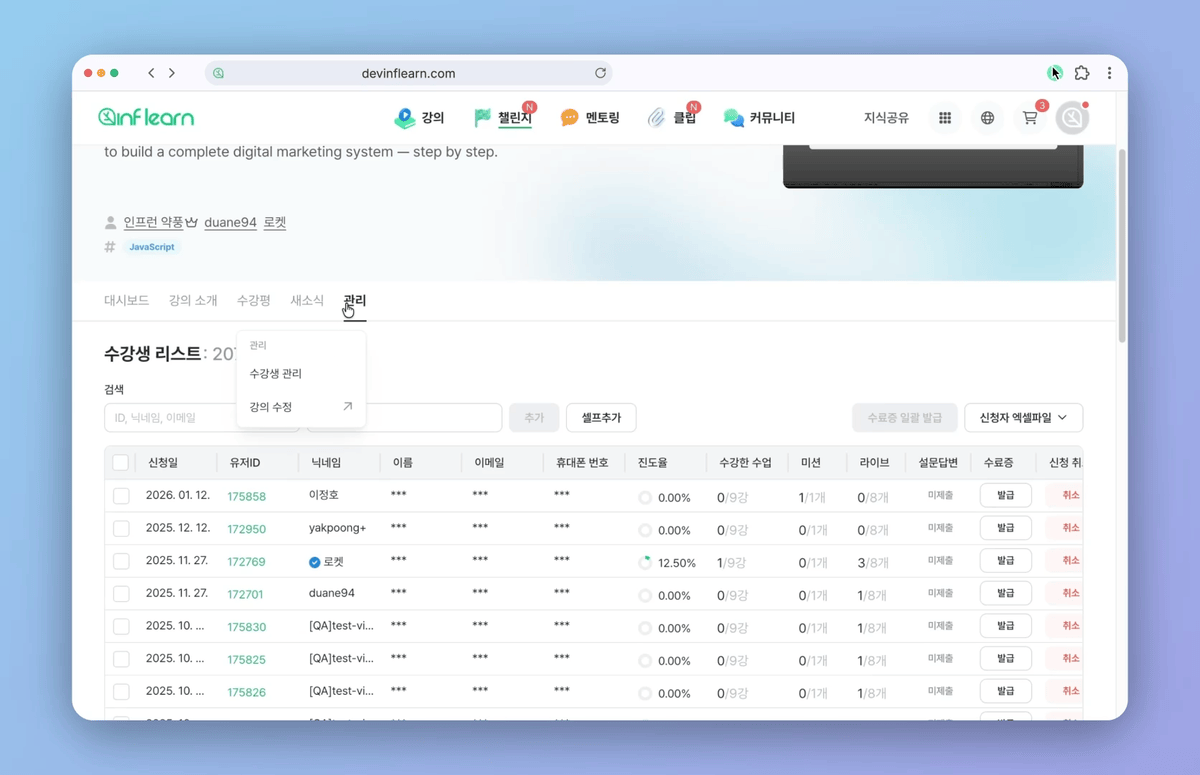 챌린지 - 수강생 관리