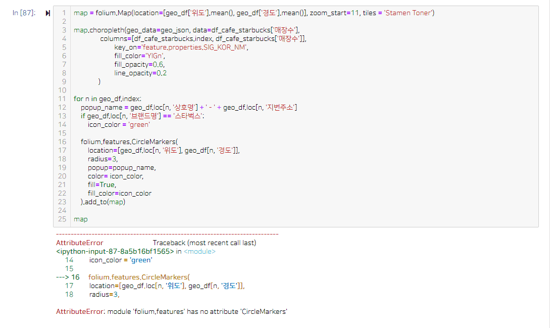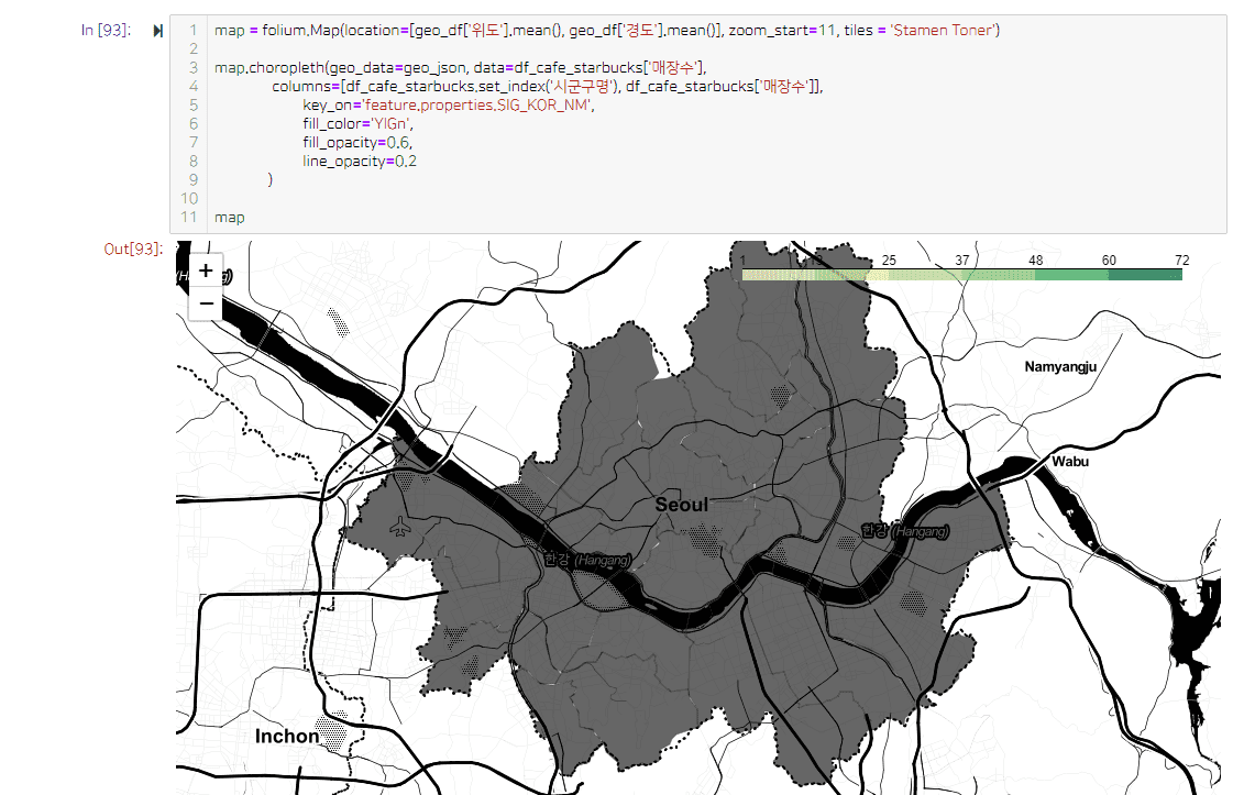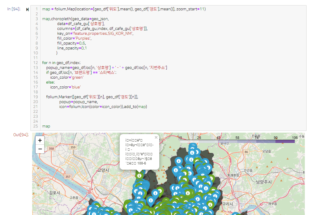 1. 시구군명 구별 불가 : 다른분이 질문 하신 걸 보고 df_cafe_starbucks.set_index('시군구명)으로 고쳐 주었는데요