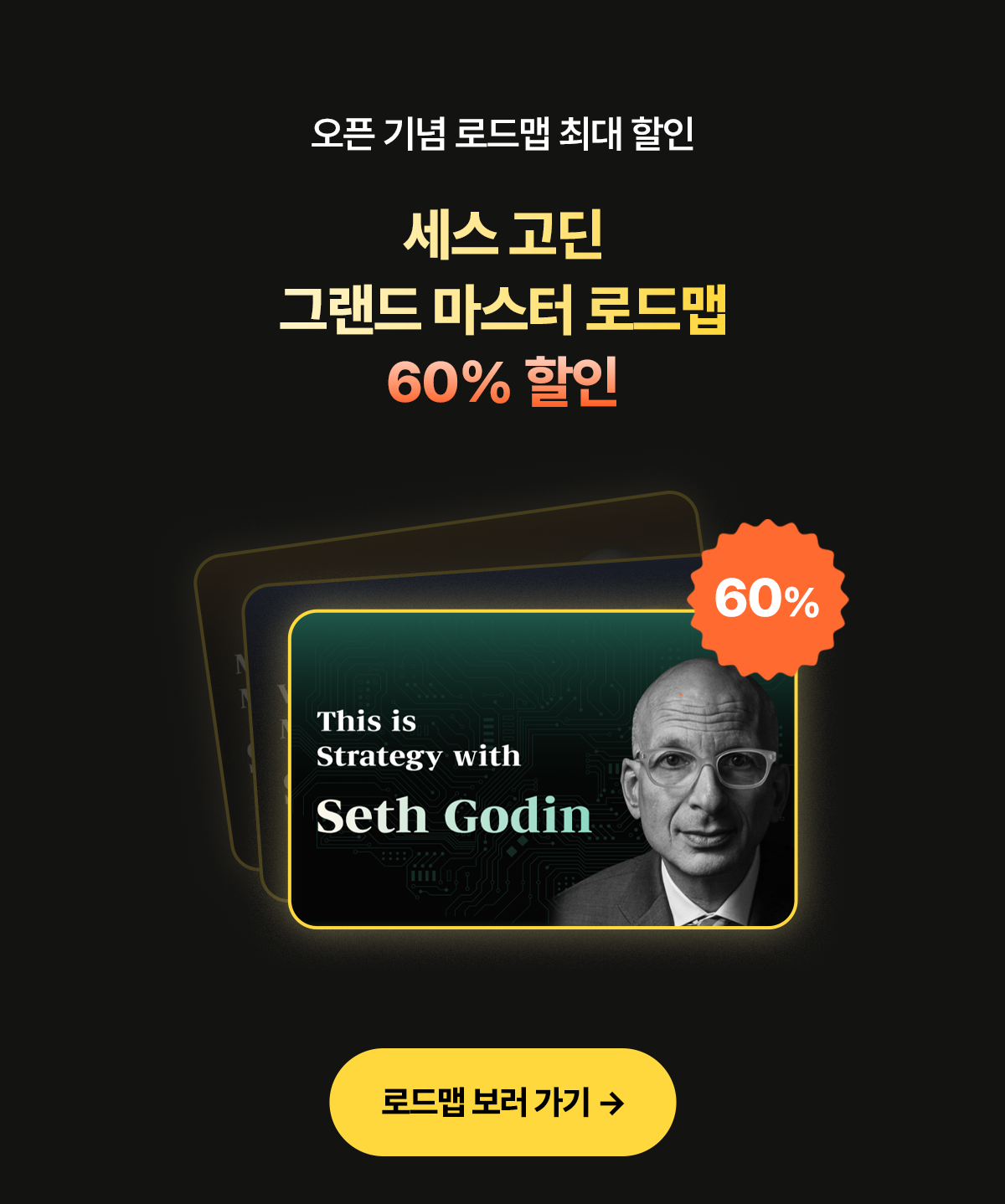 레벨 입문 Seth Godin 세스 고딘의 마스터클래스: 전략 수업 가격 218,900원 별점 4.1 ( 리뷰 9 ) studentCount +100명 exclusive 독점 adminStudentCount 109명