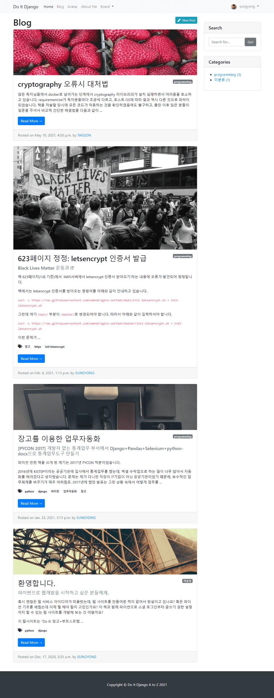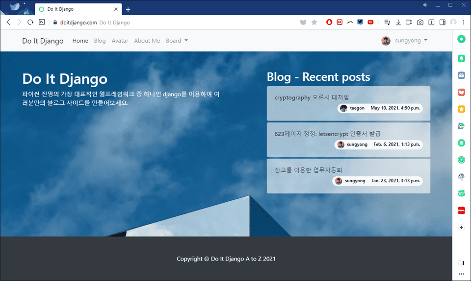 22년 1월에 시작하여, 중간에 우여곡절도 많이 겪고 포기할까 생각도 많이 했지만 어느덧 22년 마지막 날인 12월 31일에 완강했네요. 깃허브나 AWS 인스턴스명 같은걸 Do_It_Django_2022 이런 식으로 해뒀는데 2022년에 완강하게 되어 너무 기쁩니다..ㅎㅎ 본 강의를 통해 파이썬을 활용하여 프론트엔드와 백엔드 부분을 상당 부분 구현 가능하다는 점을 배울 수 있었고, docker, aws, letsencrypt, https 인증 등 생소한 요소들이 많았는데 이러한 부분을 접하는 값진 경험이 되었습니다. 완강 후 head_image 파일의 업로드 용량을 어떻게 수정할지, 대댓글은 어떻게 구현할지, 포스트에 댓글이 달렸을 때 어떻게 포스트 작성자에게 알림을 보낼지 등 세세한 부분을 찾아보고 수정해보면서 서버에 반영한다면 정말 본인만의 블로그가 완성될 것 같습니다.