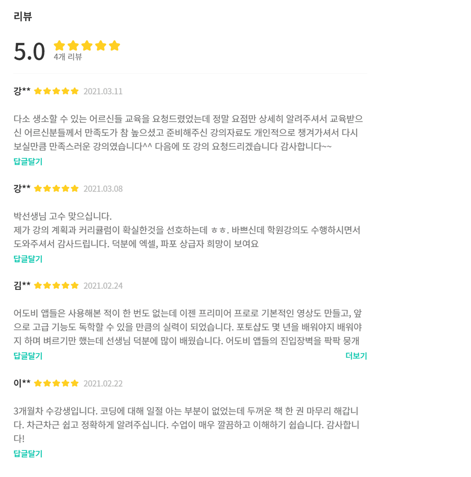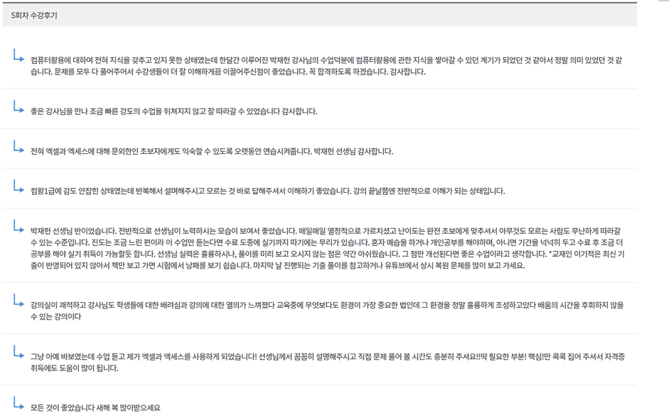 <한줄평> 여러모로 아쉬운 강의. 필기때는 차근차근 친절하게 설명 해주셔서 이해가 잘되고 학습에 큰 도움이 되었지만 실기 강의에선 솔직히 실망이네요. 몇가지 말씀드리겠습니다. 먼저, 한글 프로그램 버전자체가 다릅니다. 기본적으로 강의를 하시는 강사 입장에서 시험버전과 동일한 한글2020버전을 사용하셔야 하지 않나 생각이 드네요. 네오 버전을 쓰시더라고요. 그리고 여러곳 오타와 더불어 색상을 혼용해서 잘못 사용하신 부분이 있으신데 좀 더 꼼꼼히 확인하셨으면 좋지 않았나 싶네요. 설명을 열심히 해주시는 모습은 보이는데 처음 수강하는 사람 입장에서는 정돈되지 못하고 너무 횡설수설합니다. 이리 갔다가 저리 갔다가 깜빡하신거, 잊어버리신거, 당황하시셔서 정지되어 있는 부분 등등. 그리고 실기 강의 중 C유형만 최신입니다.. 나머지 A형은 아예 22년부터 출제되지 않아 볼 필요가 없고, B형도 예전 개정 전 과년도 기출문제로 풀이하십니다. 물론 기능면에서 대부분 여러부분 겹치긴합니다만, C형 강의처럼 개정 후의 최신 기출 문제로 강의를 해주셨으면 좋지 않았나 싶네요. 특히, 차트 같은 경우 매우 어렵게 설명하십니다.. 이 강의외에 여러 강의를 들어봤지만, 그 풀이가 간단하고 쉬운 풀이는 확실히 아닌것 같다는 생각이 여러모로 듭니다. 단축키 같은 경우 앞 강에서 알려 주시는데 막상 강의에서 풀이 하실때는 거의 대부분 리본메뉴에서 하나하나 클릭하시고 단축키를 직접 따로 활용, 사용하지 않으셨습니다. 제일 충격적이었던 것은 풀이를 전부 하신 후 정답과 다르게 나오는데도 그냥 강의를 넘어가시고 끝내더라고요.. 놀라웠습니다. <종합> 이 강의는 우리 돈 한화로 2만원 정도하는 매우 저렴한 가격입니다. 자본주의 시장 경제체계에 근거 했을때, 저렴한 가격엔 전부 이유가 있겠죠? 딱 그 가격만 합니다. 엄청난 큰 기대를 하시는건 본인 몫이지만, 적어도 양심껏 판단하시면 좋겠네요. 그나마 긍정적으로 보는면은, 실기 강의는 매우 실망이었지만, 그래도 필기 강의 3강만 본다면 꽤나 도움이 되는듯 합니다. 이상 합격자 입장에서 말씀드렸습니다. 감사합니다.