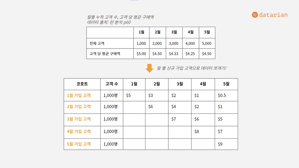 Vào ngày đầu tiên đi làm, trưởng nhóm của bạn đột nhiên đến bàn làm việc của bạn và hỏi, "Chúng tôi đã ra mắt một dịch vụ vào tháng 1. Bạn có thể xem thử xem mọi thứ có ổn không?" Anh ấy để lại một tách cà phê trên bàn làm việc của bạn. Số lượng khách hàng đang tăng lên 1.000 mỗi tháng và số tiền mua hàng trung bình của mỗi khách hàng là 5.000 won vào tháng 1, 4.300 won vào tháng 2 và 4.500 won vào tháng 3. Trưởng nhóm, chúng ta... có ổn không?