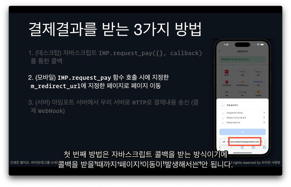 Tôi có thể tìm hiểu thông tin chung liên quan đến thanh toán bằng iamport. Trên hết, tôi nghĩ các bài giảng đều tổng hợp những điểm chính có thể áp dụng ngay vào thực tế. Chuỗi quy trình đưa sản phẩm vào giỏ hàng, thanh toán, xác minh trạng thái thanh toán và hủy đều được bao gồm. Trong số nhiều khóa học tôi đã trả tiền gần đây, đây là một khóa học đáng đồng tiền bát gạo. Tuy nhiên, trong quá trình triển khai một trung tâm mua sắm thực tế, thật đáng thất vọng khi nội dung của các bước trên trong bài giảng lại ngắn gọn và chỉ chứa những phần chính. Tôi mong muốn những bài giảng về các tình huống thực tế đa dạng hơn sẽ được bổ sung thêm. Ví dụ: việc triển khai thanh toán bởi người dùng ẩn danh là một tình huống thực sự có vấn đề. Riêng bài giảng hiện tại đã khác với các bài giảng khác, nhưng tôi hy vọng rằng nó sẽ được cập nhật từng chút một với nội dung bổ sung, khiến nó trở thành bài giảng mà tôi sẽ xem đi xem lại nhiều lần. Đó là một bài giảng mà tôi rất muốn giới thiệu cho những người xung quanh.