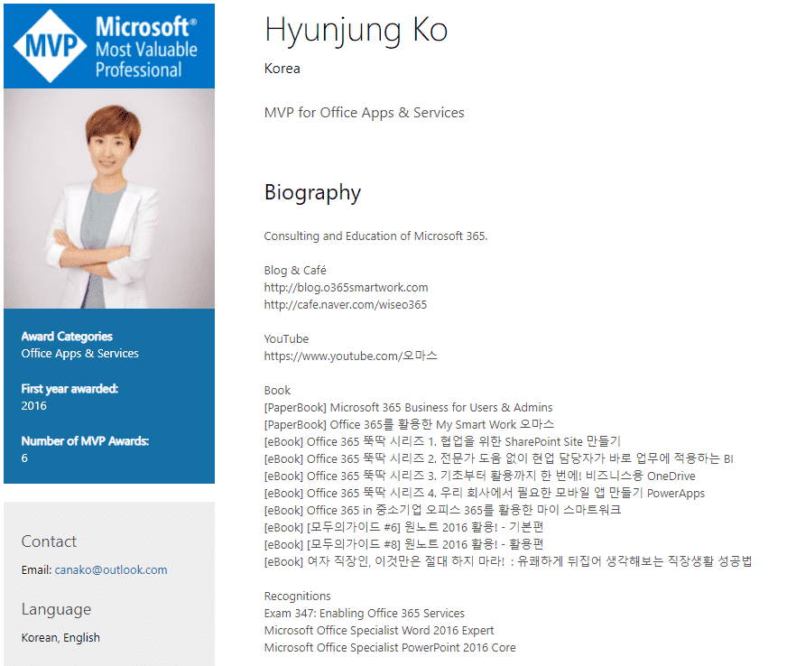 고현정 강사 Microsoft MVP (Microsoft 365 Apps&Services, 2016 ~ 현재)