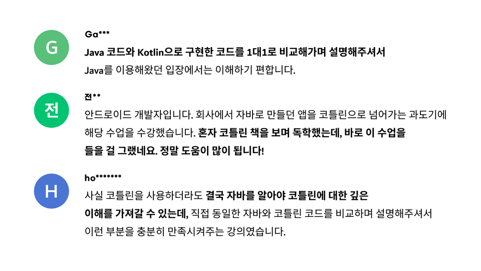 이 강의를 통해 Kotlin 언어의 특성과 배경, 문법과 동작 원리, 사용 용례, Java와 Kotlin을 함께 사용할 때에 주의할 점 등을 배울 수 있습니다.