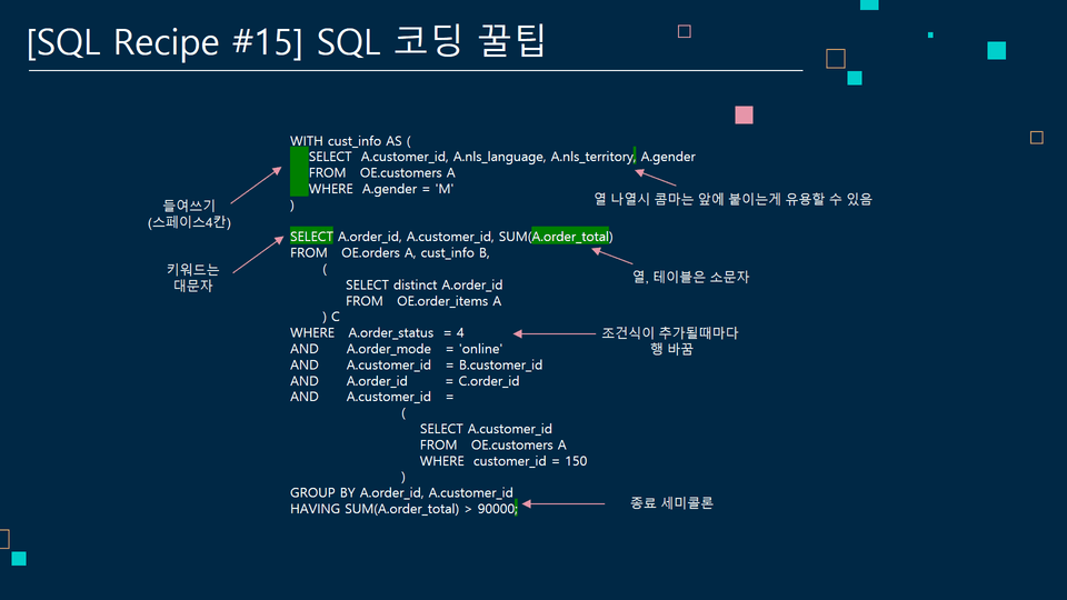 강의 잘들었습니다 유익한 시간이었습니다. 쪼개기 조립해보기 좋았어요 조금 더 어렵고 긴 쿼리를 해석할수있는 수업도 있었으면 좋았을텐데 아쉽지만 잘들었습니다.